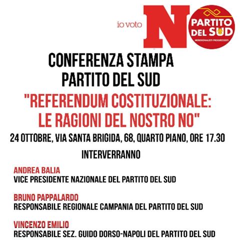 Il Partito del Sud, sostenitore del NO al Referendum Costituzionale dalla prima ora, ha deciso di ufficializzare la propria posizione per motivi che verranno illustrati da Andrea Balia, Vice Presidente del Partito del Sud, Bruno Pappalardo, Responsabile Regionale Campania del Partito del Sud e l’Avvocato Vincenzo Emilio, Responsabile della Sezione Guido Dorso di Napoli del Partito del Sud.