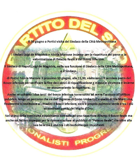 Martedì, 30 Giugno 2015, alle ore 11,30 saremo col Sindaco della Città Metropolitana di Napoli alla riapertura e visita del Bosco Reale in zona Miglio d'Oro con i dirigenti ed amici delle nostre sezioni locali di S.Giorgio(Na) e Portici (Na) del Partito del Sud impegnati in questa pregievole iniziativa.